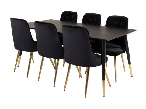 Magasság: 755 mm || Szélesség: 900 mm || Hosszúság: 1800 mm || Szék méretek: 885 x 500 x 660 || A pult vastagsága: 25 mm || Ülésmagasság: 490 mm || Az ülés szélessége: 500 mm || Üléspárna mélység: 490 mm || Lábak magassága: 725 mm || Maximális teherbírás: 30 kg || A munkalap maximális teherbírása: 30 kg || Maximális súly kapacitás személyenként: 150 kg || Székek száma: 6 || Hosszabbíthatóság: Nem || Asztallap anyaga: Természetes fa furnér || Asztallap anyaga: Közepes sűrűségű farostlemez || Váz anyaga: Fém || Ülés: Kárpit || Széktest: Laminált forgácslap || Széklábak: Fémes || Asztal színe: Aranysárga || Asztal színe: Fekete || Szék színe: Aranysárga || Szék színe: Zöld || Kombináció: Nem változtatható || Anyagtípus: Bársony || Anyagtípus: Acél