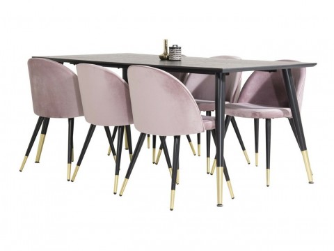 Magasság: 755 mm || Szélesség: 900 mm || Hosszúság: 1800 mm || Szék méretek: 765 x 500 x 570 || Ülésmagasság: 465 mm || Az ülés szélessége: 410 mm || Üléspárna mélység: 425 mm || Háttámla magassága: 345 mm || A munkalap maximális teherbírása: 20 kg || Maximális súly kapacitás személyenként: 110 kg || Székek száma: 6 || Hosszabbíthatóság: Nem || Asztallap anyaga: Közepes sűrűségű farostlemez || Váz anyaga: Fém || Ülés: Kárpit || Széktest: Természetes fa furnér || Széklábak: Fémes || Asztal színe: Fekete || Szék színe: Rózsaszín || Szék színe: Fekete || Kombináció: Nem változtatható || Anyagtípus: Bársony