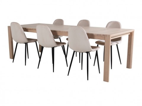 Magasság: 750 mm || Szélesség: 950 mm || Hosszúság: 1700 mm || Maximális hossz: 2500 mm || Szék méretek: 880 x 425 x 530 || A pult vastagsága: 25 mm || Ülésmagasság: 415 mm || Az ülés szélessége: 425 mm || Üléspárna mélység: 390 mm || A munkalap maximális teherbírása: 70 kg || Maximális súly kapacitás személyenként: 110 kg || Székek száma: 6 || Hosszabbíthatóság: Igen || Asztallap anyaga: Fa || Váz anyaga: Fa || Ülés: Kárpit || Széktest: Fa || Széklábak: Fémes || Asztal színe: Sötét tölgy || Szék színe: Fekete || Szék színe: Beige || Kombináció: Nem változtatható || Anyagtípus: Acél || Anyagtípus: Bársony || Fa: Tölgy