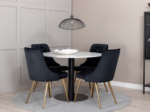 Magasság: 740 mm || Átmérő: 1400 mm || Szék méretek: 870 x 570 x 600 || Ülésmagasság: 480 mm || Az ülés szélessége: 430 mm || Üléspárna mélység: 440 mm || Székek száma: 6 || Hosszabbíthatóság: Nem || Asztallap anyaga: Közepes sűrűségű farostlemez || Asztallap anyaga: Természetes fa furnér || Váz anyaga: Fém || Ülés: Kárpit || Széklábak: Fémes || Asztal színe: Fekete || Szék színe: Sárgaréz || Szék színe: Fekete || Kombináció: Nem változtatható || Anyagtípus: Bársony || Fa: Eukaliptusz