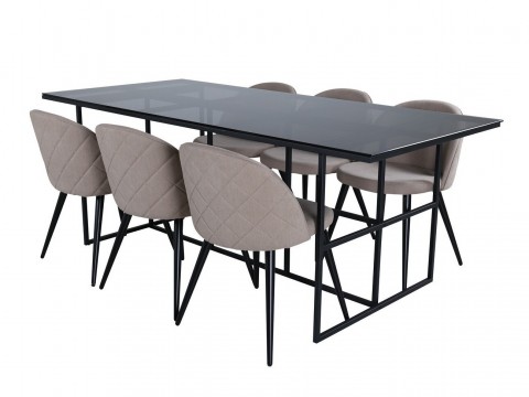 Magasság: 740 mm || Szélesség: 900 mm || Hosszúság: 2000 mm || Szék méretek: 765 x 500 x 570 || A pult vastagsága: 28 mm || Ülésmagasság: 465 mm || Az ülés szélessége: 410 mm || Üléspárna mélység: 425 mm || Lábak magassága: 712 mm || Maximális súly kapacitás személyenként: 110 kg || Székek száma: 6 || Hosszabbíthatóság: Nem || Asztallap anyaga: Edzett üveg || Váz anyaga: Fém || Ülés: Kárpit || Széktest: Laminált forgácslap || Széklábak: Fémes || Asztal színe: Fekete || Szék színe: Sötétszürke || Szék színe: Fekete || Kombináció: Nem változtatható || Anyagtípus: Acél
