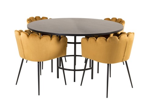 Magasság: 740 mm || Átmérő: 1400 mm || Szék méretek: 765 x 610 x 540 || Ülésmagasság: 480 mm || Az ülés szélessége: 450 mm || Üléspárna mélység: 420 mm || Maximális súly kapacitás személyenként: 100 kg || Székek száma: 4 || Hosszabbíthatóság: Nem || Asztallap anyaga: Közepes sűrűségű farostlemez || Váz anyaga: Fém || Ülés: Kárpit || Széklábak: Fémes || Asztal színe: Fekete || Szék színe: Fekete || Kombináció: Nem változtatható || Anyagtípus: Bársony