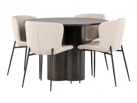 Magasság: 750 mm || Átmérő: 1100 mm || Szék méretek: 795 x 480 x 540 || A pult vastagsága: 18 mm || Ülésmagasság: 475 mm || Az ülés szélessége: 480 mm || Üléspárna mélység: 420 mm || Lábak magassága: 732 mm || A munkalap maximális teherbírása: 80 kg || Maximális súly kapacitás személyenként: 150 kg || Székek száma: 4 || Hosszabbíthatóság: Nem || Asztallap anyaga: Közepes sűrűségű farostlemez || Asztallap anyaga: Természetes fa furnér || Váz anyaga: Közepes sűrűségű farostlemez || Ülés: Kárpit || Széklábak: Fémes || Asztal színe: Barna || Szék színe: Sötétszürke || Szék színe: Fekete || Kombináció: Nem változtatható || Anyagtípus: Acél || Anyagtípus: Teddy
