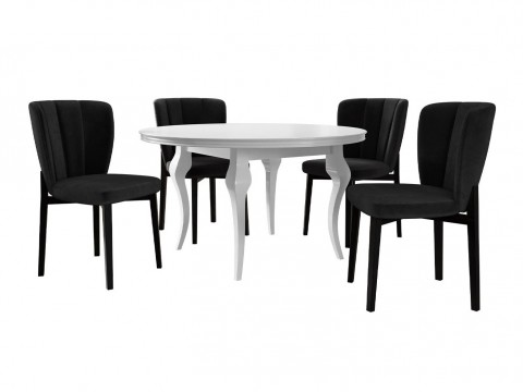 Magasság: 760 mm || Átmérő: 1000 mm || Maximális hossz: 1400 mm || Szék méretek: 840 x 500 x 550 || A pult vastagsága: 50 mm || Ülésmagasság: 480 mm || Az ülés szélessége: 480 mm || Üléspárna mélység: 350 mm || Ülés vastagsága: 50 mm || Háttámla magassága: 360 mm || Háttámla szélessége: 480 mm || Lábak magassága: 710 mm || Súly: 42 kg || Székek száma: 4 || Hosszabbíthatóság: Igen || Asztallap anyaga: Közepes sűrűségű farostlemez || Váz anyaga: Fa || Ülés: Kárpit || Széktest: Laminált forgácslap || Széklábak: Fa || Asztal színe: Fényes fehér || Szék színe: Fekete || Kombináció: Változtatható || Ellenállóság: 60000 Martindale - ciklus || Anyagtípus: Bársony || Fa: Bükkfa