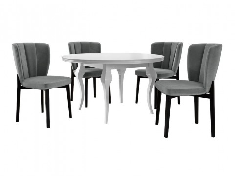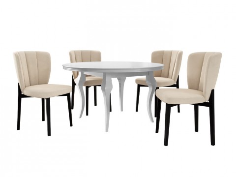 Magasság: 760 mm || Átmérő: 1000 mm || Maximális hossz: 1400 mm || Szék méretek: 840 x 500 x 550 || A pult vastagsága: 50 mm || Ülésmagasság: 480 mm || Az ülés szélessége: 480 mm || Üléspárna mélység: 350 mm || Ülés vastagsága: 50 mm || Háttámla magassága: 360 mm || Háttámla szélessége: 480 mm || Lábak magassága: 710 mm || Súly: 42 kg || Székek száma: 4 || Hosszabbíthatóság: Igen || Asztallap anyaga: Közepes sűrűségű farostlemez || Váz anyaga: Fa || Ülés: Kárpit || Széktest: Laminált forgácslap || Széklábak: Fa || Asztal színe: Fényes fehér || Szék színe: Fekete || Szék színe: Világosbarna || Kombináció: Változtatható || Ellenállóság: 60000 Martindale - ciklus || Anyagtípus: Bársony || Fa: Bükkfa