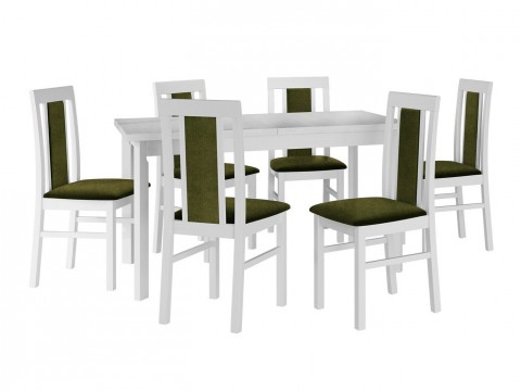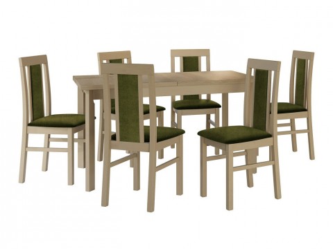 Magasság: 780 mm || Szélesség: 800 mm || Hosszúság: 1400 mm || Maximális hossz: 1800 mm || Szék méretek: 960 x 430 x 400 || A pult vastagsága: 32 mm || Ülésmagasság: 470 mm || Lábak magassága: 478 mm || Maximális súly kapacitás személyenként: 120 kg || Székek száma: 6 || Hosszabbíthatóság: Igen || Asztallap anyaga: Laminált forgácslap || Váz anyaga: Fa || Ülés: Kárpit || Széktest: Fa || Széklábak: Fa || Asztal színe: Dió || Szék színe: Zöld || Szék színe: Dió || Kombináció: Nem változtatható || Kiegészítő anyag: ABS || Ellenállóság: 45000 Martindale - ciklus || Fa: Bükkfa