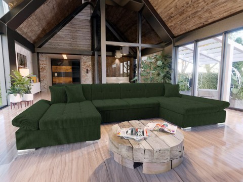 Magasság: 900 mm || Szélesség: 2400 mm || Mélység: 1900 mm || Ágyneműtartó méretei: 150 x 1750 x 670 || Ülésmagasság: 450 mm || A kartámasz magassága: 690 mm || Karfa szélesség: 130 mm || Háttámla magassága: 500 mm || Háttámla vastagsága: 290 mm || Alvás funkció: Igen || Alvó funkció: Dolphin || A fekvőfelület szélessége: 1200 mm || A fekvőfelület hossza: 2150 mm || Lábak: Fém || Lábak: Műanyag || Lábmagasság: 120 mm || Súly: 108 kg || Ágyneműtartó: Igen || Rugó: Zig Zag típus || Univerzális sarokkanapé: Igen || Szín: Fekete || Szín: Sötétzöld || Anyagok: Kárpit || Ágytest anyaga: Fa